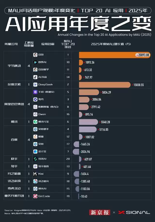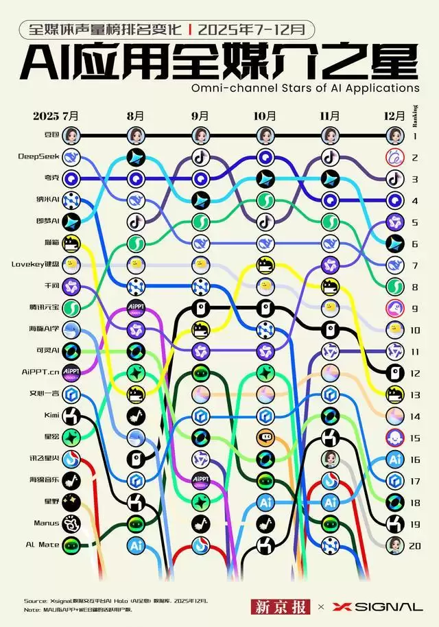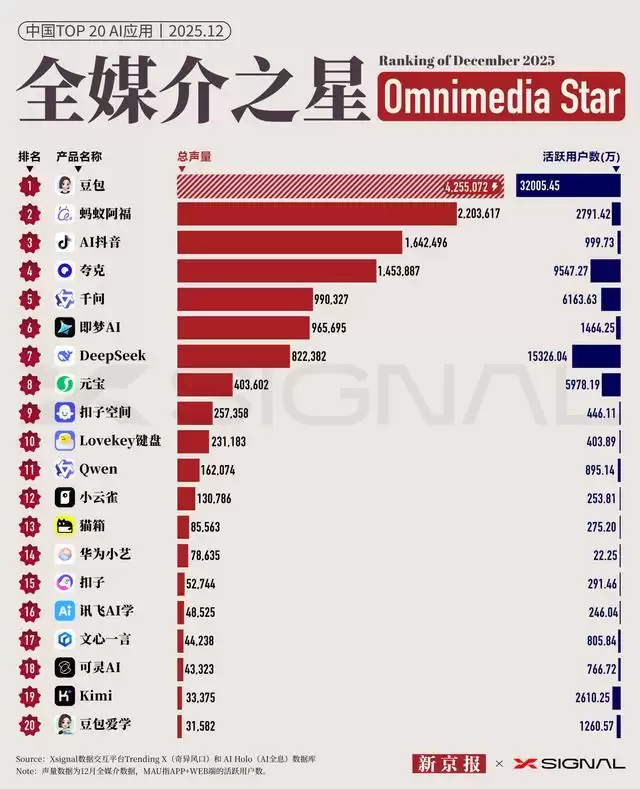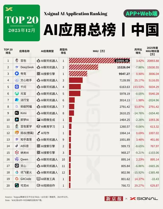 这份榜单由新京报AI研究院与Xsignal联合编制,依据全媒介声量评出2025年12月国内最具影响力的20款AI应用,同时收录产品类别、所属企业及最新月活跃用户数据,以反映行业动态。