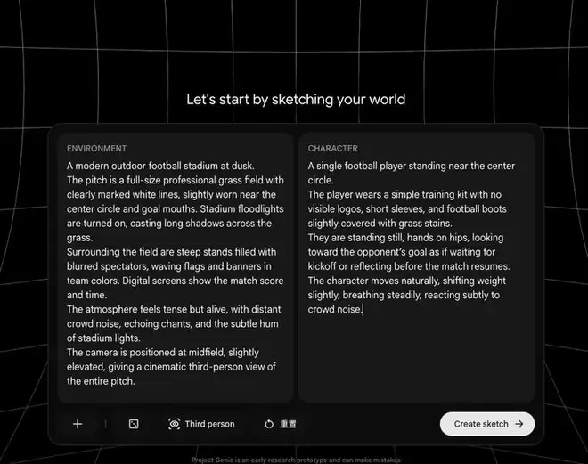 从生成质量来看,Project Genie 与传统视频生成仍存在明显差异,但在“世界还原”层面已经相当完整。prompts中提到的球场、草地、傍晚光照、电子大屏、观众挥舞旗帜都被还原。此外,人物的初始位置同样符合语境,从中圈附近出发,身着简洁的训练服,与整体世界设定保持一致。
