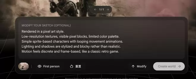 我们再来尝试一个第一视角,并且尝试给生成的世界换一个截然相反画风,观察 Project Genie 对整体风格切换的处理能力。