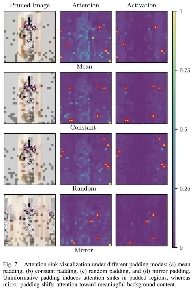 第二类是padding引发的attention sink现象。在实际输入中,为了统一尺寸,图像往往需要padding,但这些区域在语义上是「空白」的。然而,由于hidden state中出现异常激活,padding对应的token反而可能获得较高attention,从而被错误地保留下来。下图是pad区域填充不同的数值时,pad区域对应的attention score数值以及hidden states的激活值。