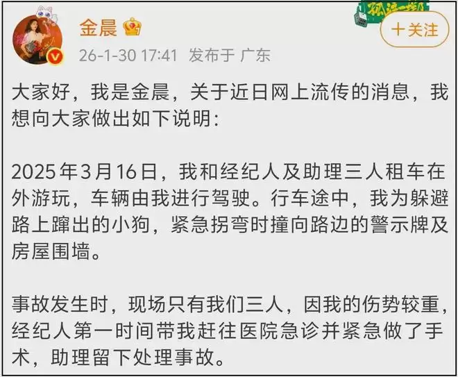 注意四个重点:1.金晨开的车是租的;2.开车的是金晨;3.金晨为了躲避小狗,撞到了警示牌和房屋围墙;4.金晨之所以离开现场,是因为伤势较重,经纪人带着她赶往医院急诊并做了手术。