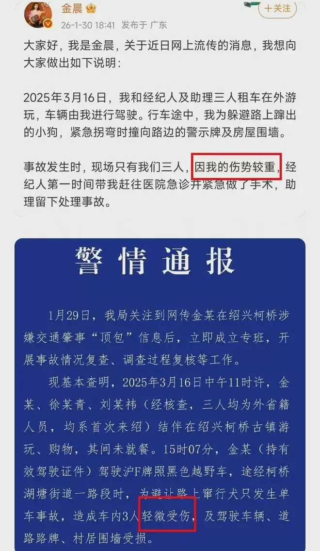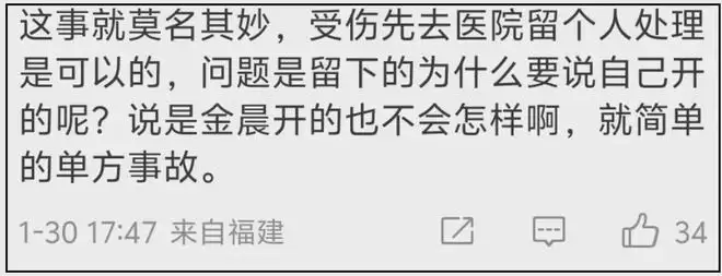 ——金晨只提到自己伤势严重,通报则是表示车上三人都是轻微受伤,既然都是轻微受伤,为什么助理能留下处理事故,金晨就不能等一等呢?