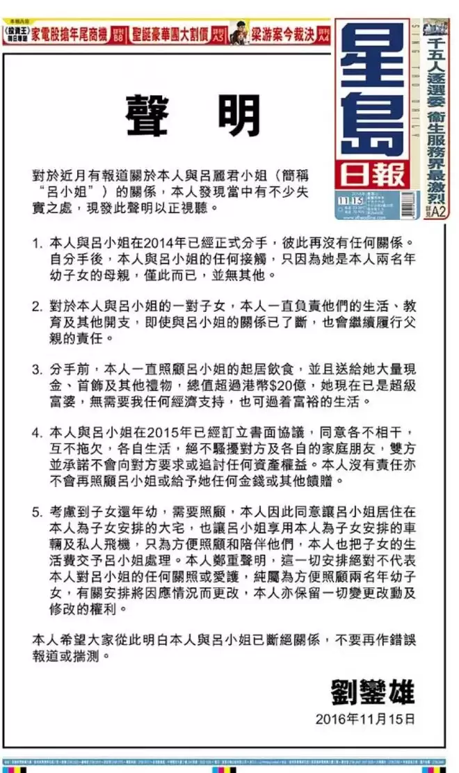 如果说2008年的声明是彼此斗法,那么2014年到2020年的一系列财经公告,则是这场豪门大戏的最终判决。2016年,大刘在《明报》等媒体登报声明,宣布与吕丽君已于2014年分手,双方订立协议,“各不相干、互不拖欠”。声明中特别强调,他会负责子女的生活开支,但与吕丽君本人再无瓜葛。随后的2017与2020年,大刘麾下最为重要的产业之一华人置业的股权经由长子刘鸣炜最终转至甘比及其子女手中。