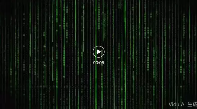 伴随着紧张的电子鼓点,《黑客帝国》风格的“0”和“1”数字铺满屏幕,瞬间形成“Vidu”的字样。细节丰富,质感饱满,极具视觉冲击力。