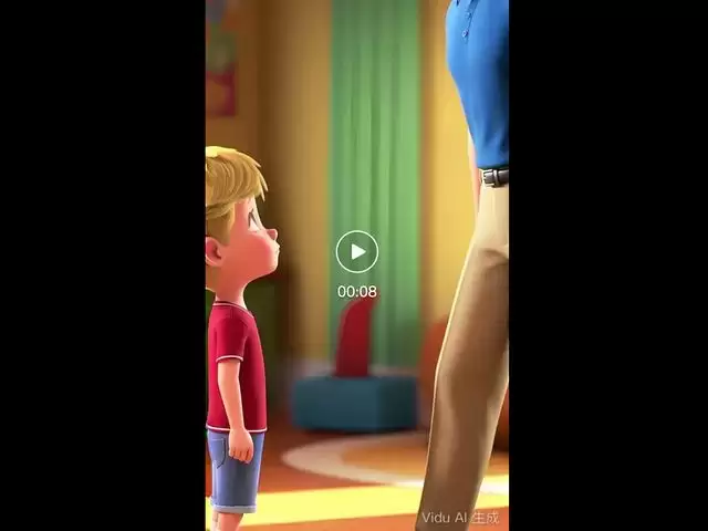 皮克斯3d动画风格。分镜一(中景/侧面视角):温暖明亮的背景中,传来衣物摩擦的沙沙声,右侧成年人缓缓蹲下,与左侧小男孩平视。他温和地说:“I know you’re disappointed, buddy. I really am sorry.”手势略微比划,镜头侧拍捕捉着两人之间微妙的距离感。分镜二(大人视角/小男孩特写):镜头转到成年人身后,对准小男孩的脸。他眼神低垂,嘴角微微下撇,肩膀无力地耸着。背景音乐渐弱,只听见他一声极轻的、压抑的吸鼻子声。镜头缓缓推近,背景柔化,将失望与无奈的情绪张力拉满。