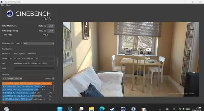 在CineBench测试标准下,该机R23多核跑分能跑到14612分,单核1950分。这个成绩放在掌机圈子里,基本上就是目前的第一梯队,甚至已经摸到了前两年一些轻薄全能本的尾巴。