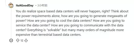 Reddit也有网友犀利指出:“算力即货币。既然相信AI是未来,那么把AI和轨道数据中心整合在一起,逻辑上完全通顺。”