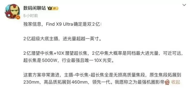 结合以往的爆料来看,OPPO Find X9 Ultra确定是双2亿。2亿超级大底主摄,进光量超越一英寸。