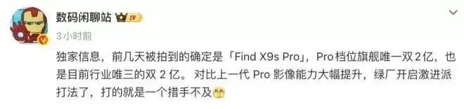 同一位博主的近日爆料显示,“前几天被拍到的确定是「Find X9s Pro」,Pro档位旗舰唯一双2亿,也是目前行业唯三的双 2 亿。 对比上一代 Pro 影像能力大幅提升,绿厂开启激进派打法了,打的就是一个措手不及”。