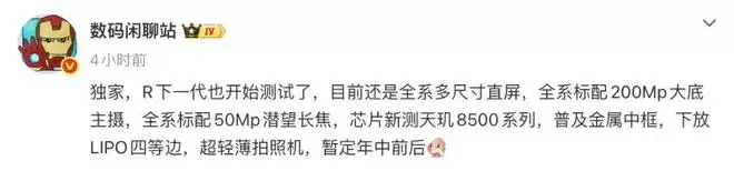 博主@数码闲聊站 的一份消息中提到,“R下一代也开始测试了,目前还是全系多尺寸直屏,全系标配200Mp大底主摄,全系标配50Mp潜望长焦,芯片新测天玑8500系列,普及金属中框,下放LIPO四等边,超轻薄拍照机,暂定年中前后”。