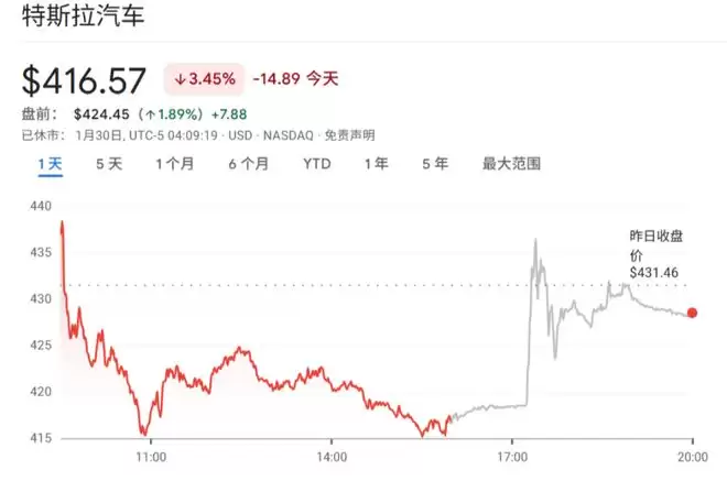 市场对这一消息反应迅速。美国东部时间1月29日,特斯拉股价发生变化,特斯拉股价在盘后交易中一度上涨约4.5%,尽管当日常规交易时段下跌约3.5%。
