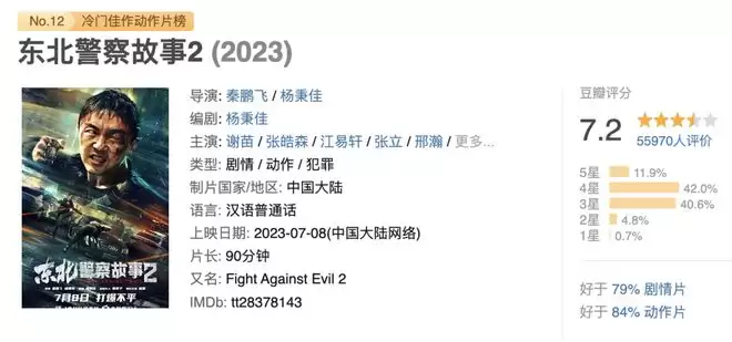 2024年10月,《东北警察故事》第一部上线,斩获2000万分账票房。两年后的第二部总分账票房接近3000万,豆瓣5万多人打出了7.2分的成绩,无论是口碑还是票房都堪称网络电影天花板。