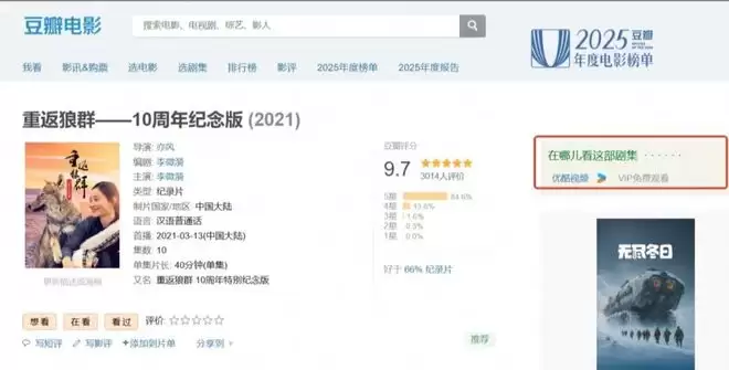2017年,电影《重返·狼群》上映;2024年,《重返狼群10周年纪念版》纪录片在优酷独家上线,更完整地补充了很多电影没来得及讲述的内容素材。如今纪录片翻红,不少新的观众纷纷来优酷站内观看这部老片。今年1月中旬,《重返狼群10周年纪念版》纪录片的第11、12集重新在优酷“满血上线”,这是目前全网唯一的纪录片完整版。