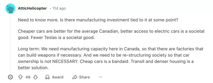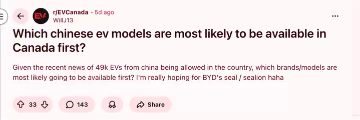 「电厂」根据海外论坛Reddit上数十篇帖子,梳理出在加拿大消费者讨论中最突出的四个议题:他们比较希望哪些车型进入加拿大?认为哪些车型最有可能进入加拿大?为什么大多数加拿大人态度比较正面?以及,加拿大人的担忧有哪些?