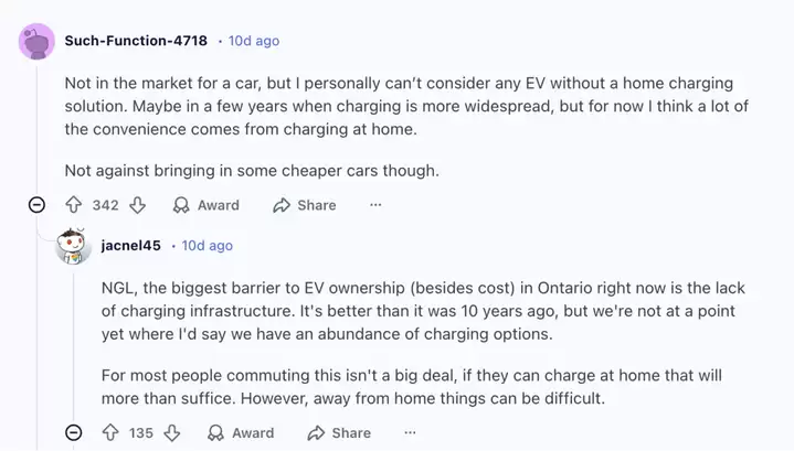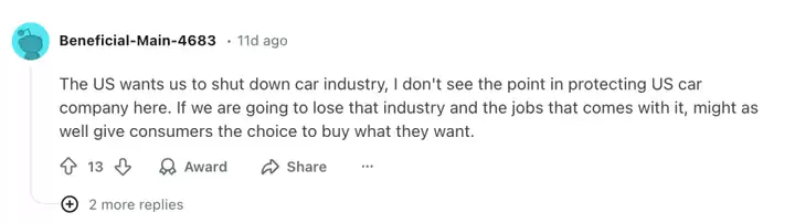 加拿大消费者希望拥有更多电动汽车选择。Abacus Data去年为Clean Energy Canada进行的民调显示,53%加拿大人支持降低关税以提升可负担性,29%甚至支持完全取消关税。正如一名网友所概括的那样:“我认为大多数人并不关心公司是谁的,他们只是想要电动汽车”。