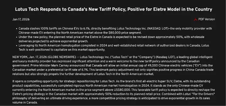 吉利旗下的豪华品牌路特斯显然也很有自信。路特斯在正式刊登了声明文章,表示作为路特斯首款纯电动超级SUV,Eletre凭借其卓越的产品性能,已于2024年成功通过北美市场严格的认证,是目前唯一一款进入北美市场、售价超过8万美元的中国制造电动汽车。新关税政策预计将使其计划零售价降低约50%,“有望推动Eletre在加拿大的销量实现指数级增长”。