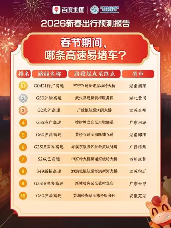 2026年春节返程高峰预测:百度地图提示易拥堵高速路段