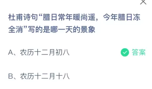 杜甫诗句“腊日常年暖尚遥,今年腊日冻全消”描绘的是哪一天的景象?支付宝小鸡课堂开课啦!每天花一分钟答题赚饲料,喂喂小鸡就能贡献爱心啦!轻松又意义十足!2026年1月31日蚂蚁庄园的小鸡课堂题目正确答案是【农历十二月初八】,诗句描绘的是腊八节(农历十二月初八)当天温暖如春、冰雪消融的特殊景象,反映了诗人对自然节候的敏感和对生活重归安定的寄托。