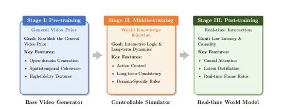 LingBot-World认为,如果要从视频生成转变成世界模型,这背后至少有三个瓶颈:高质量交互数据稀缺、标准扩散架构难以维持较长时间的叙事和结构的一致性、传统模式的计算开销巨大。