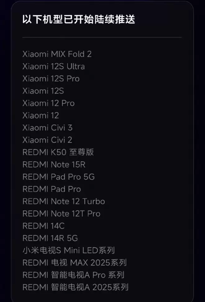 一边是面向近二十款老机型(从Xiaomi 12系列到Redmi Note系列,甚至包括平板和电视)进行大规模的系统版本升级,扩大澎湃OS的用户基数和生态壁垒。