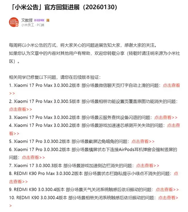 从行业角度看,小米这种公开、清单式的问题修复通报正在成为一种值得关注的新范式,它把传统的、黑箱式的系统更新说明,变成了一个可追溯、可监督的服务流程。