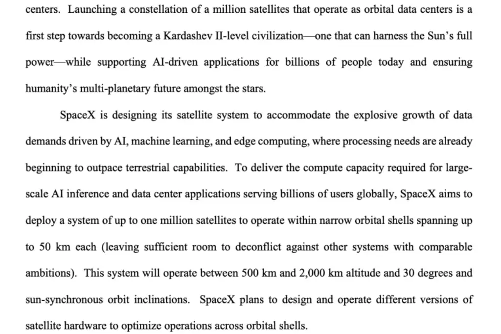 “一个拥有前所未有计算能力的卫星星座,用于驱动先进的人工智能模型及其所依赖的应用。” “为满足服务全球数十亿用户的大规模AI推理和数据中心应用所需的算力,SpaceX计划部署一个最多可达100万颗卫星组成的系统。 这些卫星将在宽度不超过50公里的狭窄轨道壳层内运行(留出足够的空间,以避免与其他具有类似目标的系统发生冲突)。”