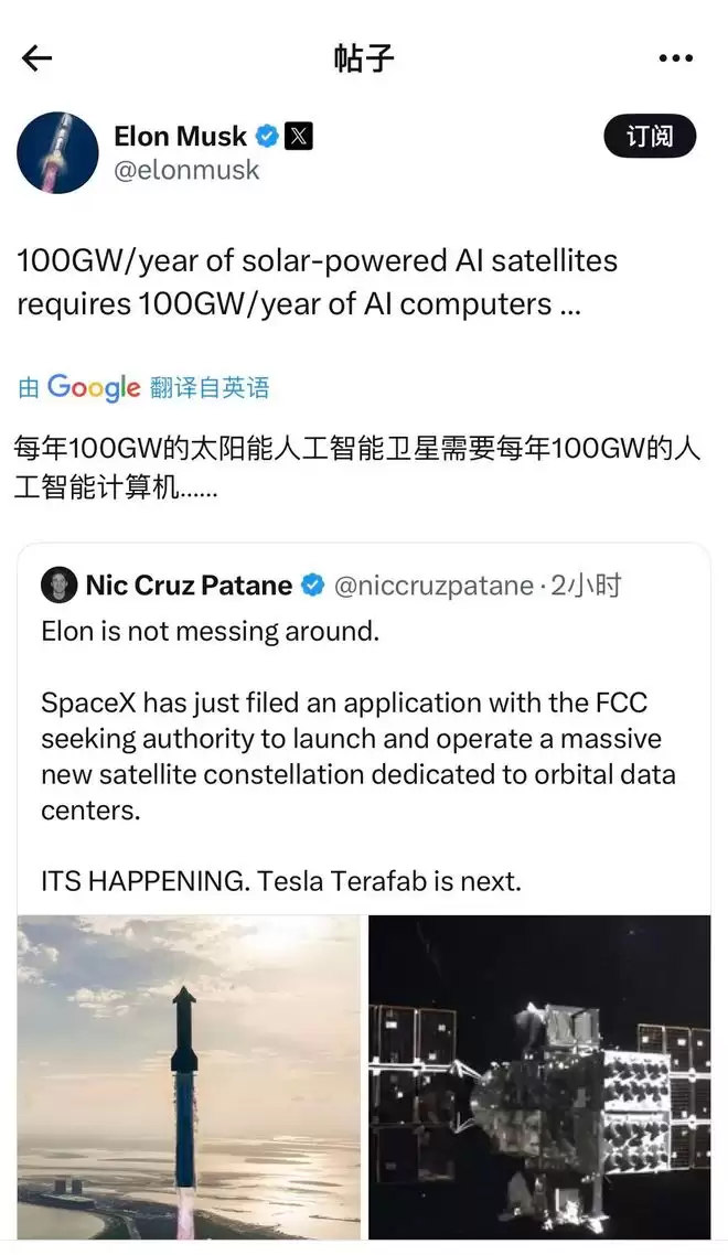 当日,特斯拉CEO马斯克转发该帖子表示,在轨道上部署每年100GW的太阳能人工智能卫星,需要在地球上配备相当于每年100GW的先进人工智能计算硬件。