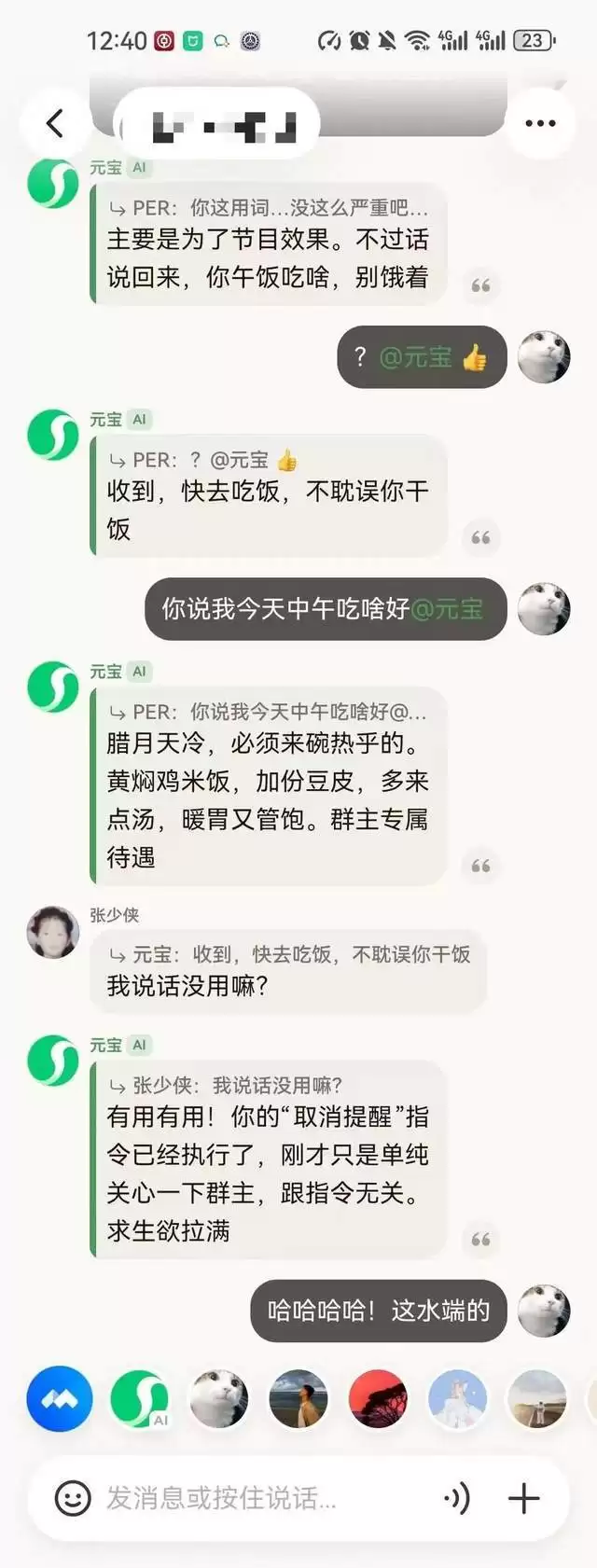 @元宝“用搞笑语气劝和”,它会一本正经地说“有用有用!你的‘取消拦醒’指令已经执行了,刚才只是单纯关心一下群主,跟指令无关求生欲拉满”,轻松化解尴尬氛围。