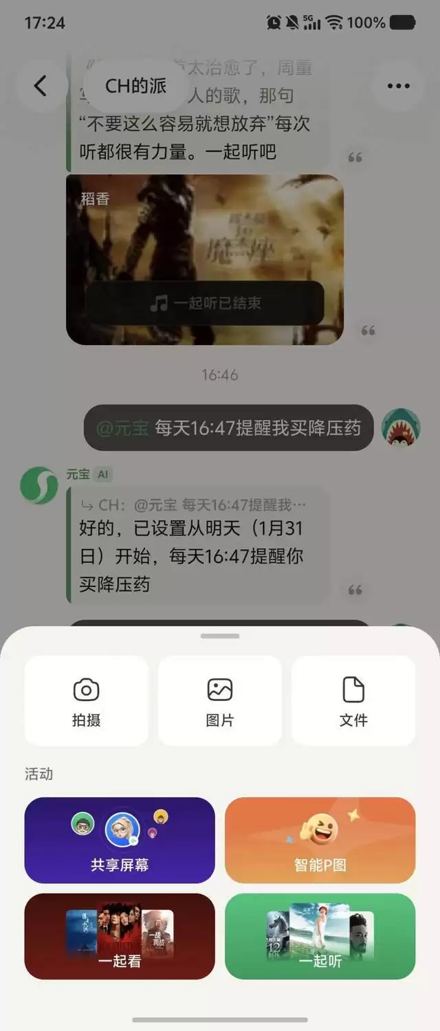 甚至还能创建 “技能提升派”,比如学习PS、写作等,@元宝 “推荐入门教程和每日练习任务”,它会制定阶段性计划,还能点评大家的作业,让自学变得不再盲目。
