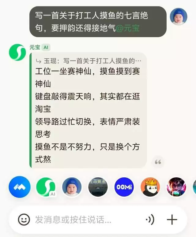 想玩文字梗?在“搞笑创作派”里@元宝“写一首关于打工人摸鱼的七言绝句,要押韵还得接地气”,它秒回“键盘敲得震天响,其实都在逛淘宝......”,瞬间点燃群里的创作欲。