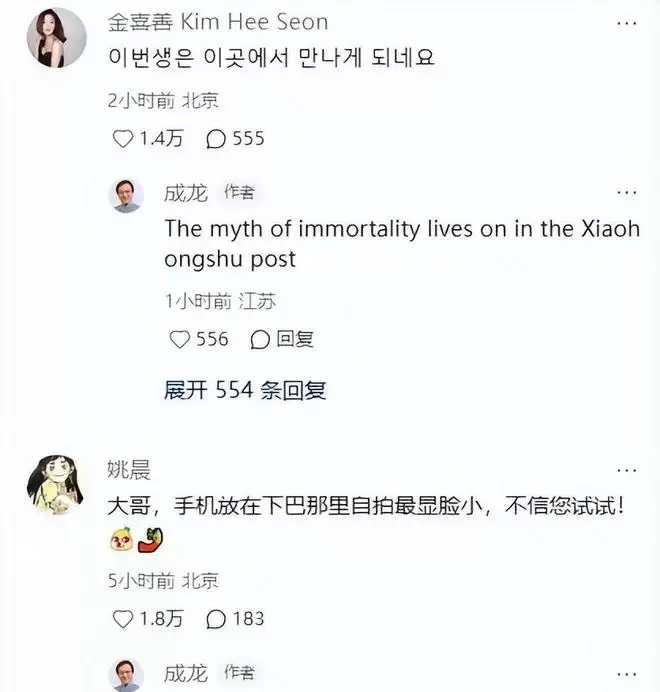姚晨几乎是秒评:“大哥,手机放下巴那里自拍最显脸小,不信您试试!” 成龙回复得超快,还带了个笑脸表情:“谢谢小姚,这是我在小红书学到的第一招,回头就试试。”