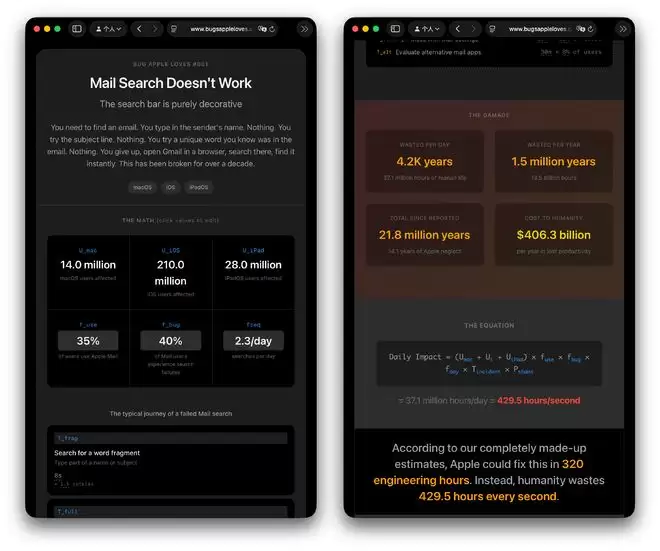 最近外媒发现了一个相当有意思的项目,它专门把这些年苹果系统里最让人抓狂的老问题做成了一个排行榜,用夸张又严肃的方式计算——这些Bug到底浪费了全世界多少“生命”。