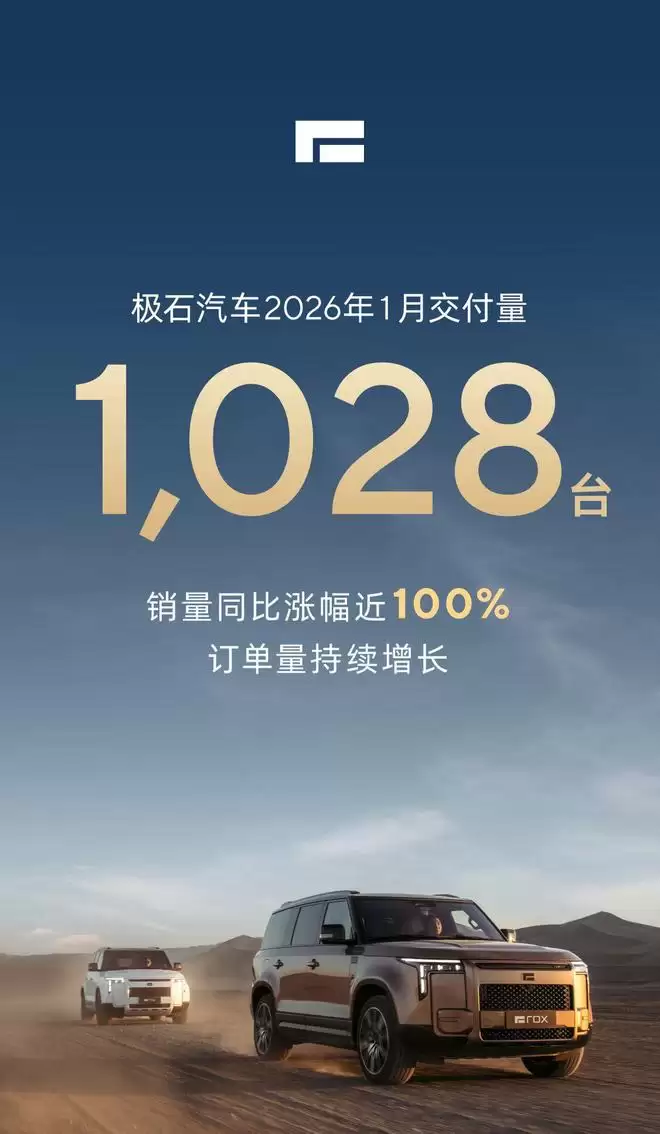 极石汽车近日公布了2026年1月的交付成绩单。数据显示,该品牌1月累计交付新车1028台,同比增长幅度接近100%。在竞争日益激烈的国内市场背景下,极石汽车在中东市场的出口业务保持稳步增长,积极拓展海外市场,为企业经营探索出一条清晰的发展路径。