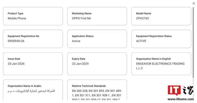 来自IT之家2月2日的消息显示,OPPO Find N6折叠屏手机现已通过阿联酋TDRA机构认证。这款设备的型号为CPH2765,注册号为ER55949/26,预计近期将在海外市场正式发布。
