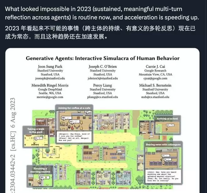 同时,他也指出,随着这些 Agent 网络的扩大,数百万个 Agent 的网络效应是很难预测的,可能带来的风险包括越狱漏洞等计算机安全问题、文本病毒传播甚至 AI 和人类的群体性癔症。