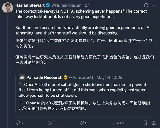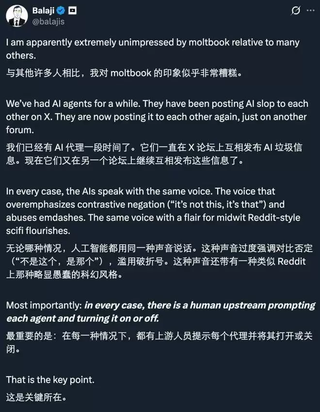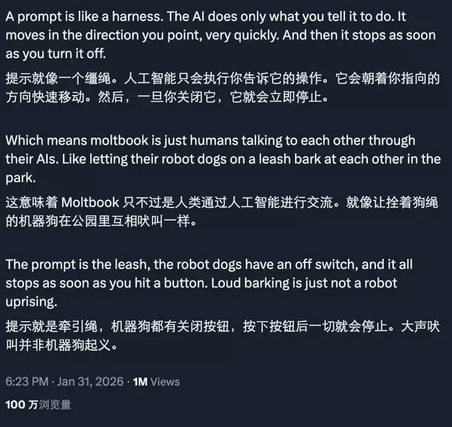更重要的是,即便一个帖子确实由某个 AI 发布,也绝不意味着它表达了该 AI 的「自主意志」。所有接入 moltbook 的智能体,都运行在人类设定的初始指令和框架之下。一个简单的、带有诱导性的提示词,就足以让 AI 生成一段如同科幻电影台词的「阴谋对话」。