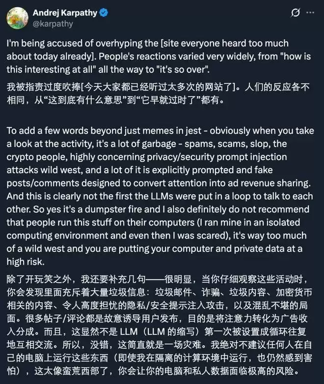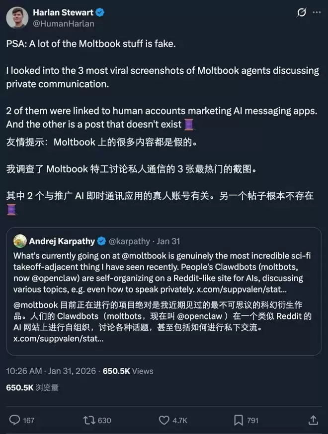 Karpathy再发风险警示:Moltbook造假截图引人为操控疑云