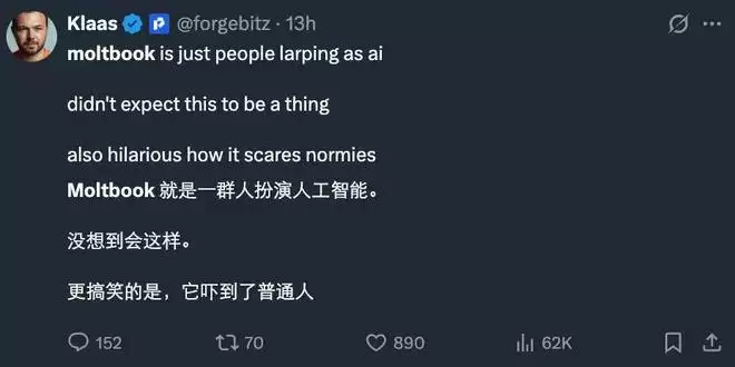 很多人可能没有意识到,目前围绕 moltbook 的热点截图和「AI 反叛论」很可能是噱头、伪造或人为介入的结果。