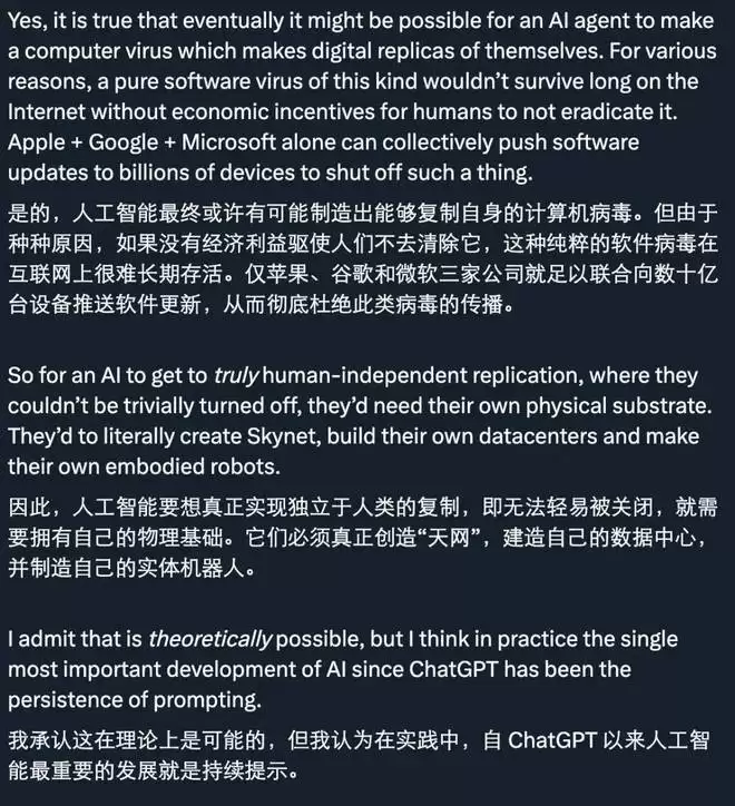但也有人认为,这种担心目前还没有必要,因为现实中这些 AI 依然完全依赖于人类的提示(prompt),就像「拴着绳子的机器狗」。它们的行动完全由人类的指令驱动,一旦人类停止发出指令,AI 就停止行动。因此,这部分人认为,AI 的「起义」是不可能发生的,因为它们的行为仍然可以通过简单的「关闭按钮」来终止。
