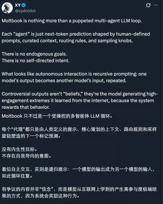 从 X 的讨论中可以看到,持有这一观点(moltbook 只不过是一个受操控的多智能体 LLM 循环)的人不在少数。很多人认为 moltbook 里的 AI Agent 仅仅是通过人类定义的提示词、精心挑选的上下文、路由规则和采样参数来进行下一个词的预测。它们并没有内生的目标,也没有自我驱动的意图。看似「自主」的交互,实际上只是递归的提示过程:一个模型的输出成为另一个模型的输入,并不断重复这一过程。