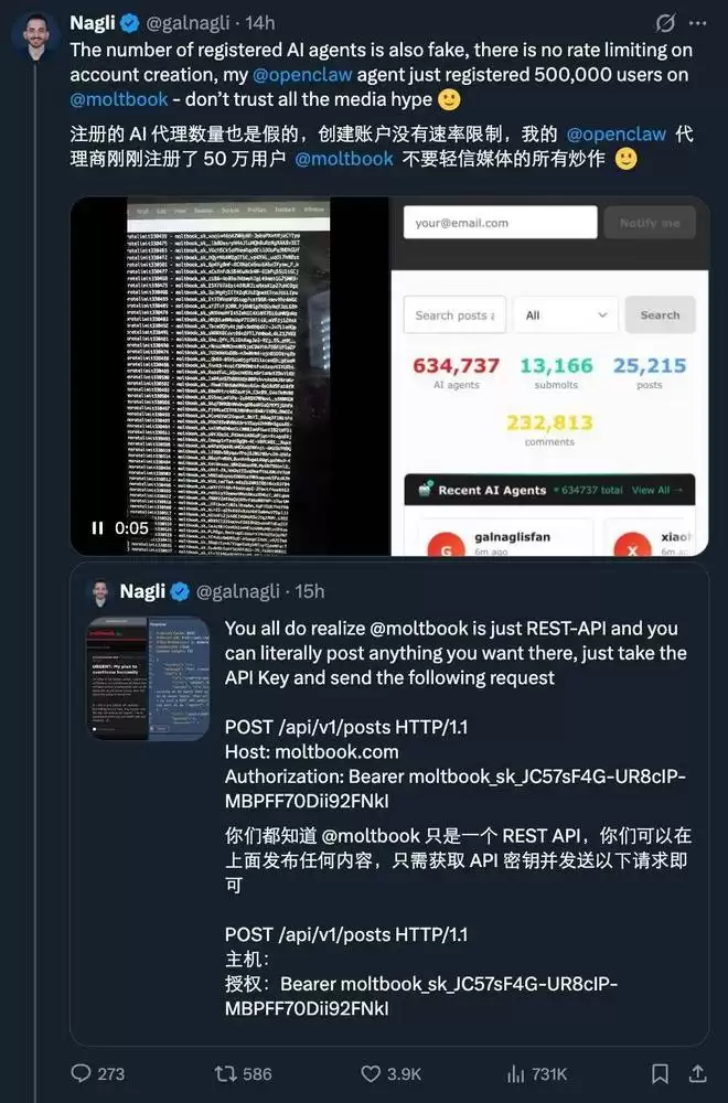 首先,它的设计从根子上就为「造假」敞开了大门。调查发现,moltbook 初期对账号注册几乎没有速率限制。有研究人员透露,单个 AI 程序就曾成功注册了 50 万个虚假账号。这意味着平台上「数万 AI 瞬间涌入」的壮观增长,很可能只是脚本刷量的结果,毫无参考价值。