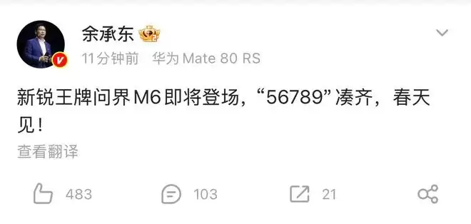 二月二日,华为常务董事、产品投资评审委员会主任、终端BG董事长余承东在社交平台透露,备受期待的新锐王牌问界M6即将登场,“56789”全员集结,静待春日的正式亮相。