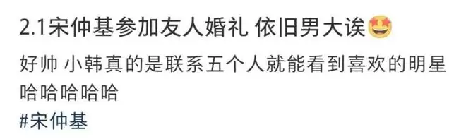 那他们的近况怎么样?据网友爆料,2月1日,宋仲基和老婆去参加朋友的婚礼。网友夸他状态很好,依旧男大。