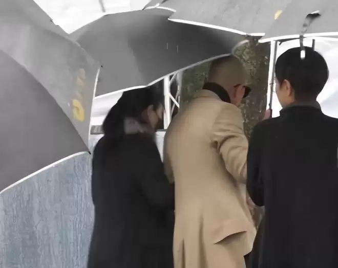 具俊晔整个人暴瘦现身,穿着棕色风衣的他手拿文件夹,S妈挽着具俊晔神情哀伤,一家人前往墓园。