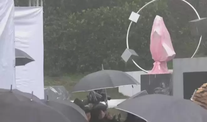 送别大S,网友留言:不是她的粉丝,从她去世开始为她发声,此刻看到她的雕像盖着粉色的丝绸,天上飘着细雨,我的泪水不由得溢出眼眶。