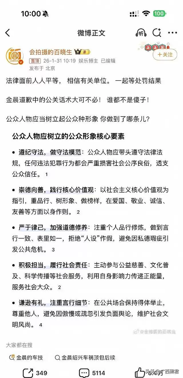 金晨作为公众人物,此前还曾通过赛车类综艺塑造过懂规则、守规矩的正面人设,此次的肇事顶包风波,让其精心打造的人设彻底崩塌,也让公众对其产生了信任危机。公众人物的影响力建立在以身作则的基础上,享受着名气带来的各种红利,就更应该承担起相应的社会责任,在言行举止上严格要求自己,遵守法律法规和社会公序良俗。一旦触碰规则的红线,即便有道歉和澄清,也难以挽回公众的信任。
