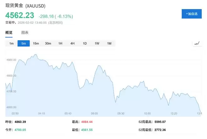 周一的市场动荡集中体现在贵金属的剧烈波动上。现货黄金失守4580美元/盎司,日内跌幅6.27%,较1月触及的近5600美元高点大幅回落。纽约期金回落至4600美元/盎司下方,日内跌3.07%。