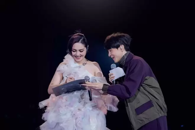 歌迷互动环节将演出推向高潮。一位来自湖北武汉的18岁女孩以活力满满的“咆哮式”示爱,热情邀请杨千嬅赴武汉开唱。杨千嬅被这份真诚打动,笑着赞叹“武汉的女孩都很酷”,更与她同台合唱《稀客》。两人歌声与全场万名歌迷的大合唱相融,经典场面再度复刻,掌声与欢呼声经久不息。