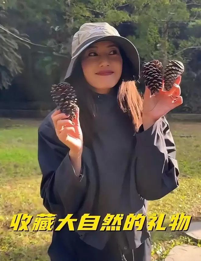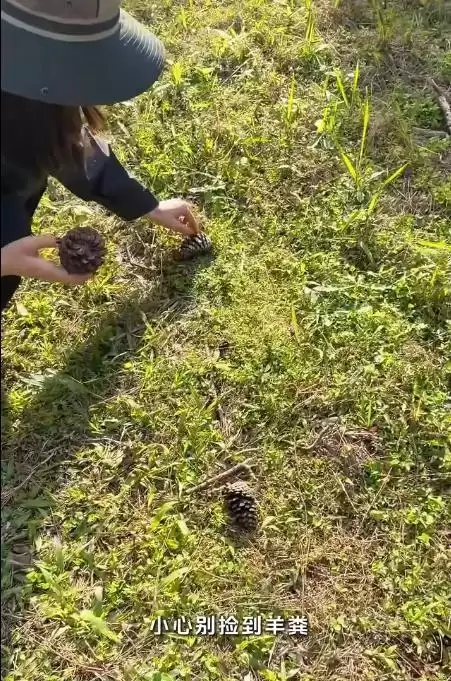 后来去天湖时,气温有所下降,她裹紧了外套,蹲在湖边捡松果,还不忘提醒镜头 “小心别捡到羊粪,我刚差点看错”;