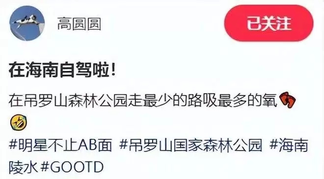 可短短 24 小时后,她就卸下了精致的妆容和高定礼服,穿着户外服装、戴着遮阳帽,把自驾车开上了吊罗山的盘山路,嘴里还念叨着 “海边已经不能满足像我这种常来海南的旅行需求,这次专门来山里‘吸氧’”